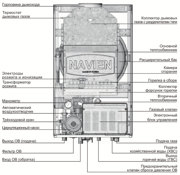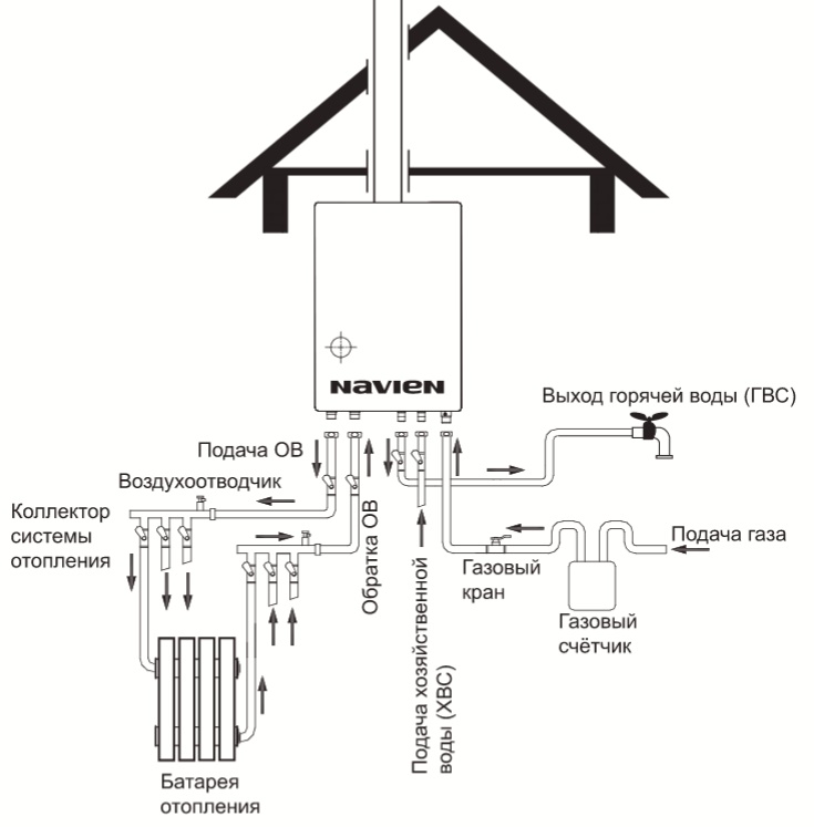 Toutes les étapes de raccordement d'une chaudière à gaz de la marque Navien doivent être effectuées conformément au schéma établi à l'avance par le service gazier avec lequel le contrat est conclu et par les plombiers desservant la maison. Il prend en compte les caractéristiques techniques d'une pièce particulière et les recommandations du fabricant de l'équipement.