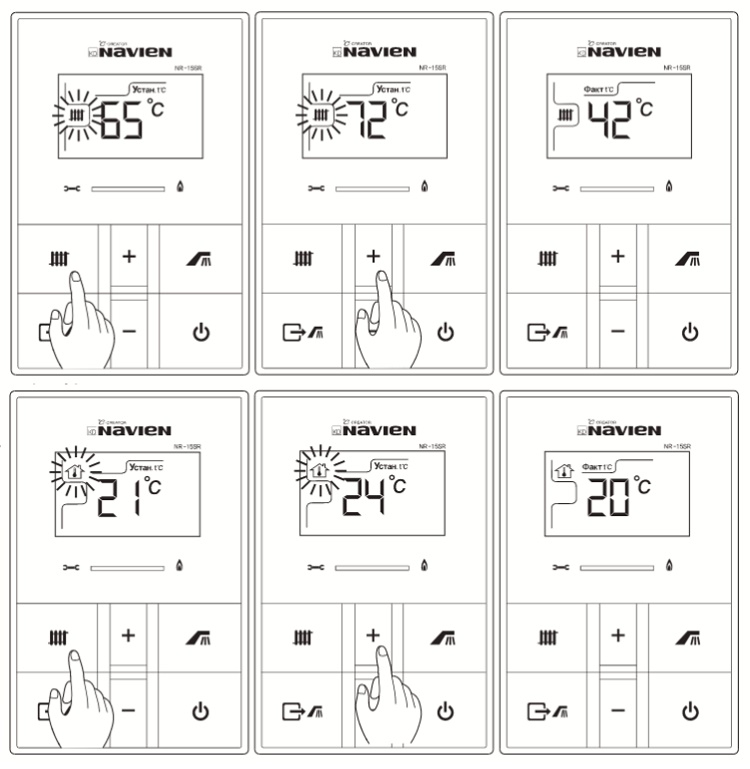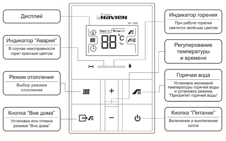 L'ensemble complet des chaudières Navien comprend un panneau de commande à distance. C'est avec son aide que le réglage est effectué. Toutes les commandes et tous les modes du panneau sont enregistrés en russe, les boutons de toutes les fonctions sont accompagnés d'icônes graphiques extrêmement claires.