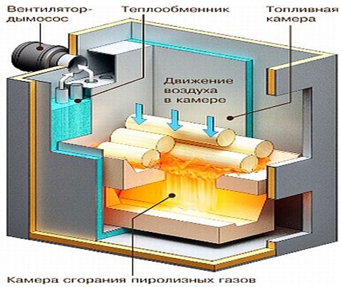 Ici, ils se mélangent à l'air et brûlent, transférant en outre à l'échangeur de chaleur une partie solide de l'énergie thermique.