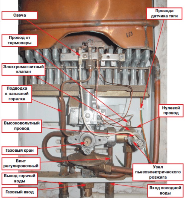 À l'intérieur de la colonne, il y a deux éléments principaux: un brûleur à gaz et un échangeur de chaleur qui ressemble à un long tuyau étroit, généralement en cuivre, enroulé par un serpent ou une spirale. L'eau froide s'écoule de l'alimentation en eau vers la batterie, chauffe au-dessus du brûleur et quitte l'appareil lorsqu'il est déjà chaud.