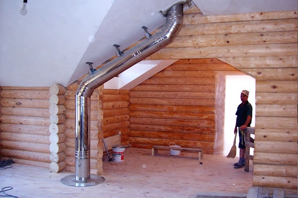 Ensuite, les éléments restants sont attachés: des tuyaux droits et des segments de coude. Pour le passage de la cheminée à travers le plafond et le toit, des pièces spéciales sont utilisées. Une attention particulière doit être portée à la sécurité incendie.