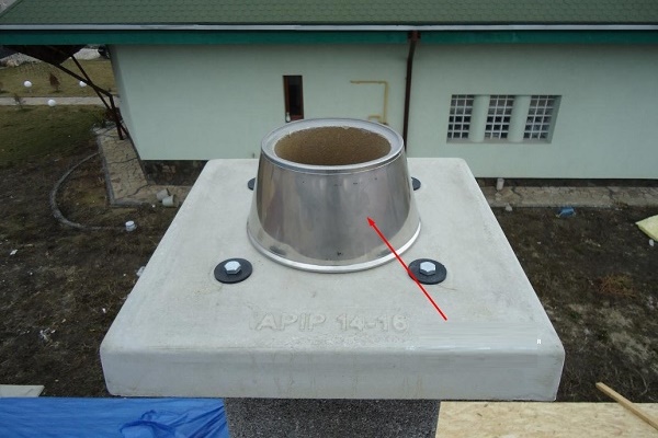 La loutre se compose de 6 rangées, le retrait de chaque suivant représente 1/8 de la brique entière. Les trous autour du tuyau sont isolés et recouverts de feuilles de toiture en acier.
