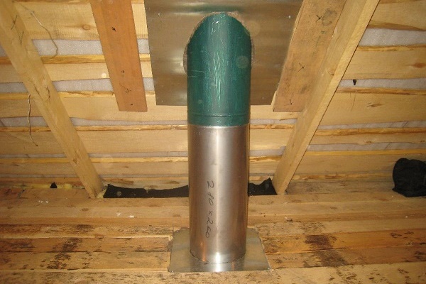 - la hauteur du tuyau au-dessus du toit est réglée par la structure du toit: sur un toit plat - 0,5 m; au-dessus du toit de 0,5, s'il est situé à une distance de 1,5 m (ou moins) de la crête; égale ou supérieure à l'axe de la crête, si elle est située à une distance de 1,5 à 3 m.