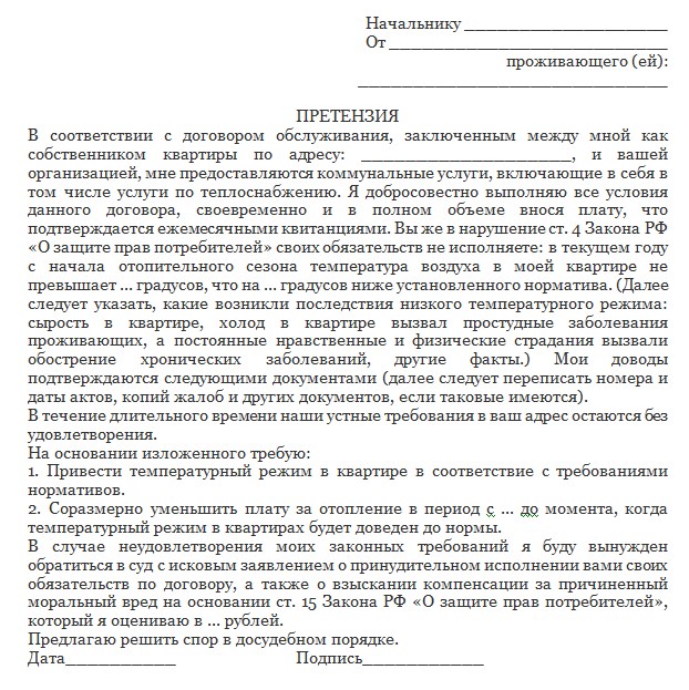 Pas besoin d'attendre l'expiration d'un délai de trois jours. Le problème du chauffage doit être résolu de toutes les manières disponibles. L'un d'eux consiste à déposer des plaintes administratives auprès des autorités réglementaires, y compris par téléphone. La première étape consiste à préparer le texte de la plainte. Ils peuvent être envoyés par courrier ou en ligne.