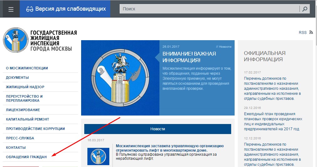 Si vous envoyez une plainte via Internet, vous devez d'abord vous rendre sur le site Web de l'inspection du logement, qui fait référence géographiquement à l'emplacement de la société de gestion.