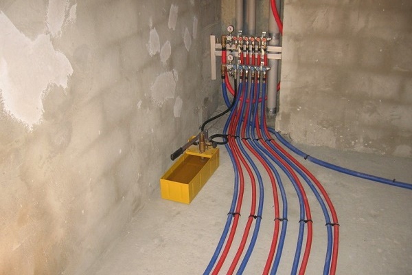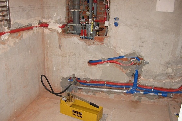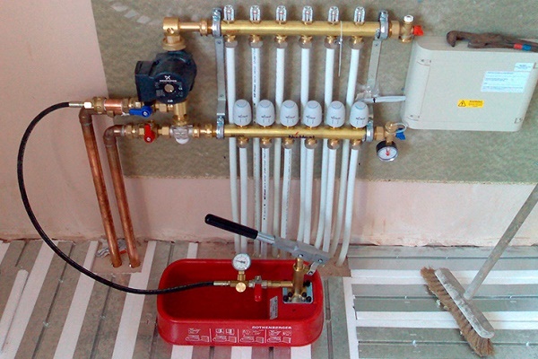 J'ai tous les tuyaux de chauffage posés dans les murs, dans un rideau en polypropylène. Par conséquent, le sertissage - c'était un processus obligatoire avant le câblage. De plus, il y a un plancher chaud dans quatre pièces, il doit également être rempli de pression d'essai avant de verser. Vous comprenez, c'est une affaire responsable.