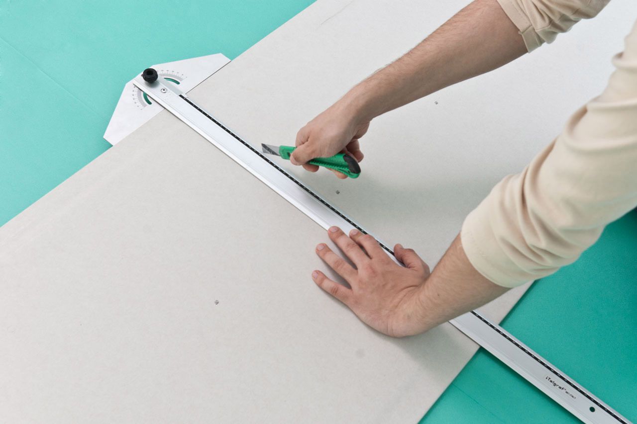 La plaque de plâtre est posée sur une surface dure afin qu'il n'y ait même pas la moindre déviation. Ensuite, une règle est appliquée à la ligne de marquage, qui est fermement fixée à la main. Si vous essayez de faire une coupe sans règle, il y a un risque élevé de gâcher la feuille.