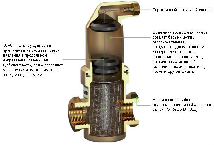 Ils sont installés le long de l'ensemble du circuit à certains points, ce qui vous permet de retirer le bouchon d'air du circuit localement, sans attendre que l'air se déplace vers le haut du système. Un tel système a été appelé un système de désaération en plusieurs étapes.