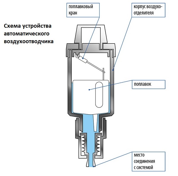 Les bouches d'aération automatiques sont de type horizontal et vertical. Ils sont installés dans des endroits où la probabilité de congestion de l'air est la plus grande. Il peut s'agir de zones où le tuyau de chauffage fait un tour, une boucle, etc.