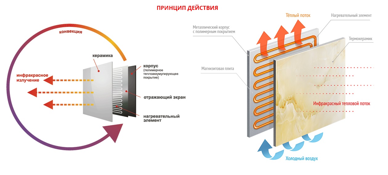Les objets prennent de la chaleur ou la transfèrent dans un espace voisin. Lors du fonctionnement de l'équipement, les surfaces des éléments intérieurs dans la zone de rayonnement sont de 7 à 10 degrés plus chaudes que l'air ambiant.