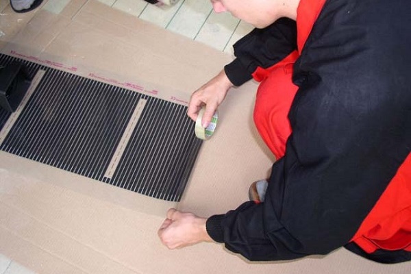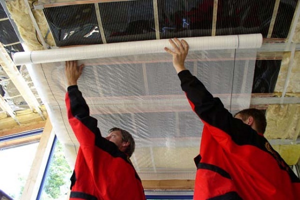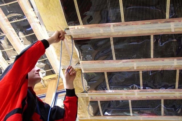 Les systèmes de film sont installés non seulement sur les planchers, mais aussi sur les plafonds sous les structures à charnières et les pentes du toit du grenier. L'installation et la connexion sont effectuées selon un schéma similaire: