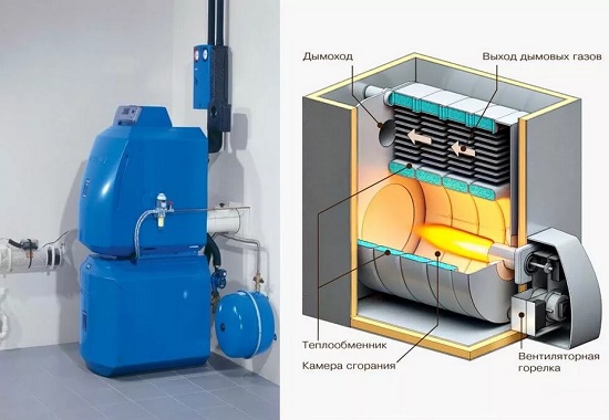 En termes d'efficacité, les chaudières à combustible liquide (diesel) diffèrent peu de leurs homologues au gaz. Cependant, ils sont plus dimensionnels et lourds. Pour leur installation nécessite un local non résidentiel séparé. Leur installation dans un chalet sous les escaliers ou dans la cuisine est strictement interdite.