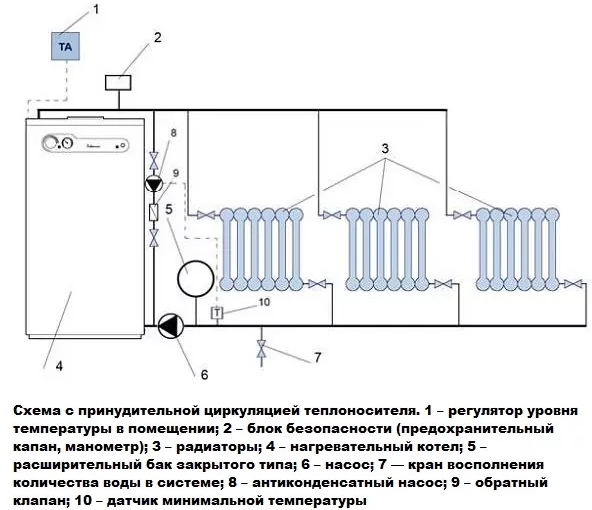 Mais le système est complété par un vase d'expansion et une pompe de circulation, de sorte qu'il existe la possibilité d'un mouvement forcé du liquide de refroidissement. Cette opération permet de choisir librement le mode de fonctionnement du système de chauffage.