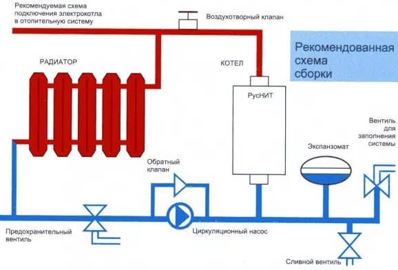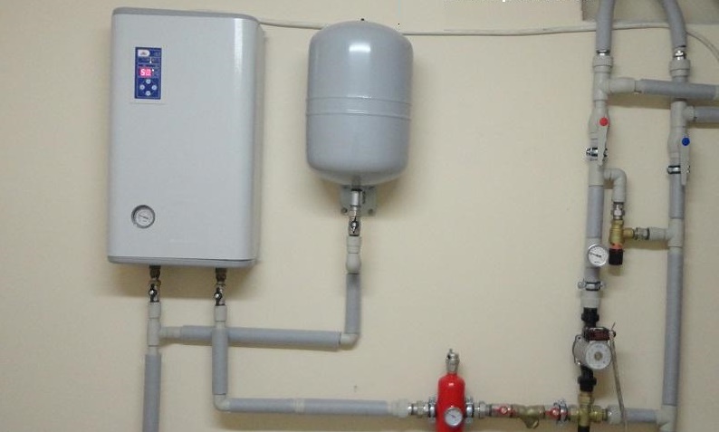 La chaudière électrique est placée en dessous, puis un vase d'expansion est connecté au système, après quoi monter la pompe de circulation.