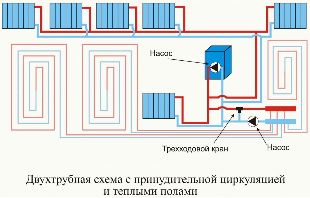 Ce type de circuit est moins sensible aux caractéristiques des tuyaux et des radiateurs, ce qui offre de nombreuses possibilités de choisir les composants appropriés. C'est dans de tels systèmes que l'antigel peut être utilisé. Les possibilités de régulation de la température de l'eau dans le circuit s'élargissent également.