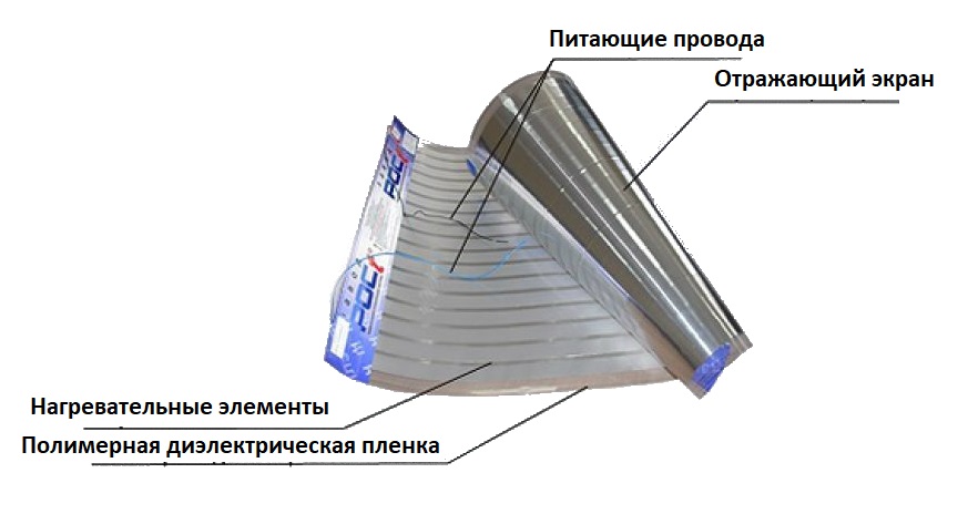 Le nom du système est déchiffré en tant que «radiateur électrique à film rayonnant». C'est cet appareil qui sous-tend le système. Sa construction est extrêmement simple. PLEN est un élément rayonnant résistif posé sur un substrat en feuille laminé dans un film résistant.