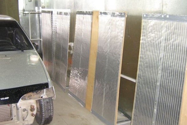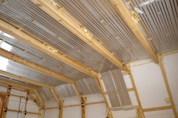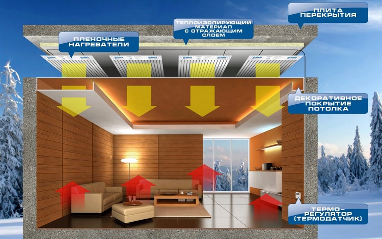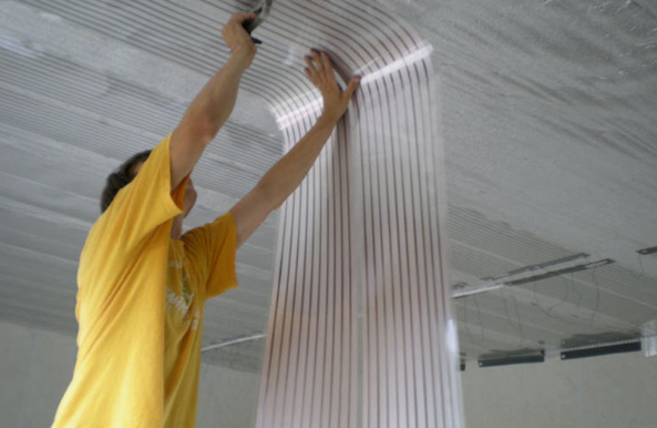 Parfois, les radiateurs à film sont fixés au plafond ou aux murs sans décoration supplémentaire. C'est faux. La feuille sur laquelle les éléments résistifs sont fixés a une réflectivité élevée.