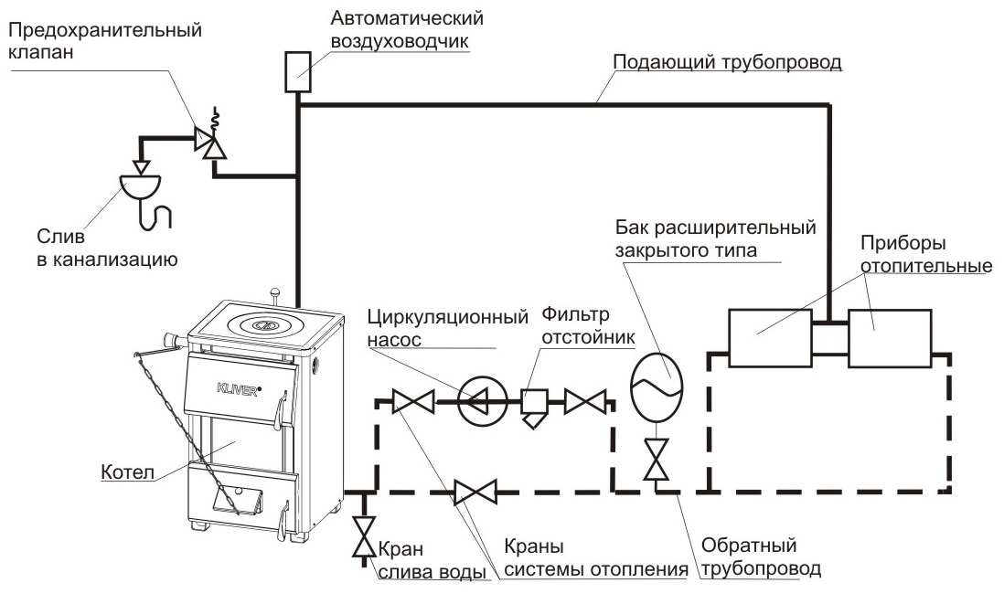 L'eau refroidie s'écoule naturellement à travers les tuyaux dans l'échangeur de chaleur pour un nouveau chauffage. L'emplacement du réservoir au point le plus élevé vous permet d'éliminer les bulles d'air pénétrant dans le système du liquide de refroidissement.