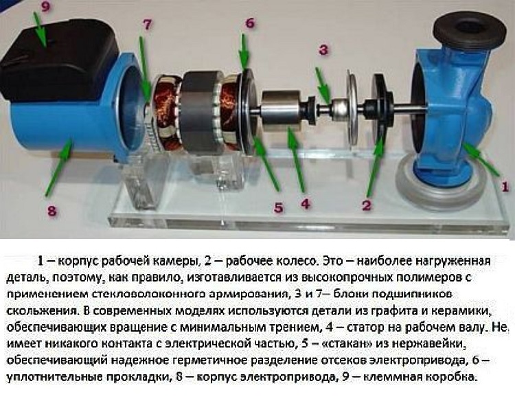 La conception de la pompe de circulation sèche n'implique pas le contact du liquide de refroidissement avec le rotor. Sa zone de travail est séparée des pièces du moteur par des anneaux spéciaux.