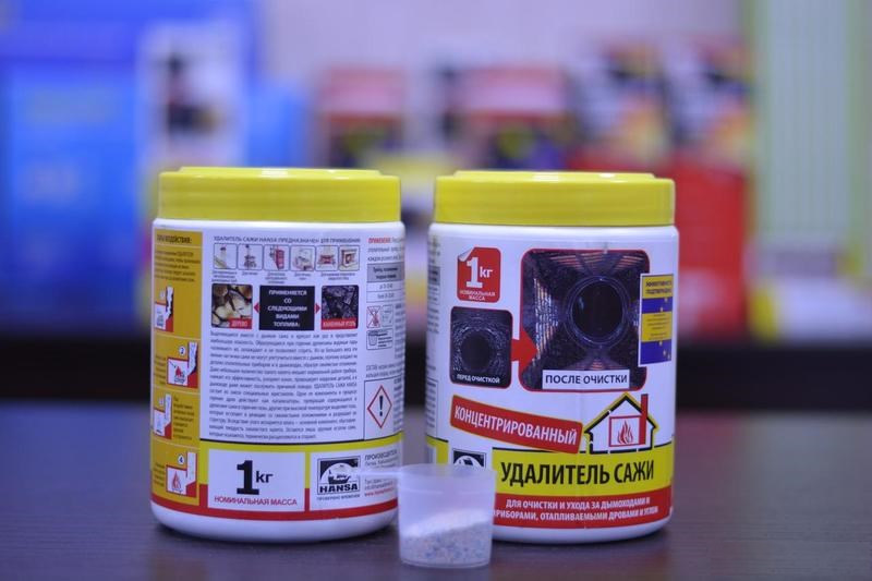 La version en boîte se compose de sels métalliques et de charbon actif. Les étiquettes externes en sont retirées, mises dans le four, aspergées d'un liquide spécial et incendiées. Le produit fonctionne pendant une heure et demie, transforme la suie en une substance fragile et stimule sa combustion rapide.