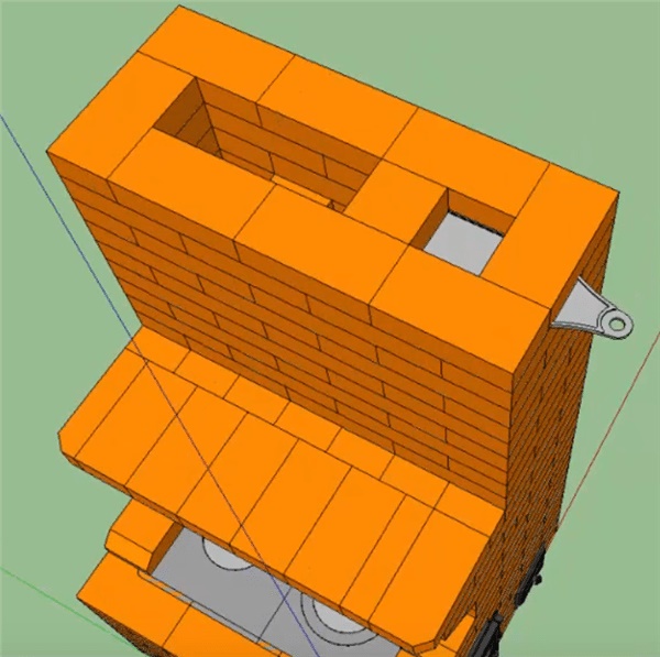 Il reste à aménager la cheminée, sa hauteur est de neuf briques. Dans cet exemple, au sixième rang de neuf, ils ont arrêté de poser la cloison entre les canaux gauche et central. Ainsi, un espace a été créé pour la libre circulation des fumées.