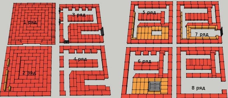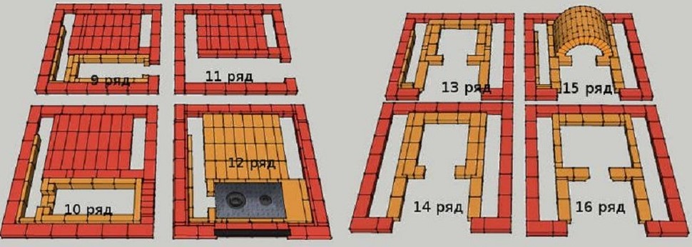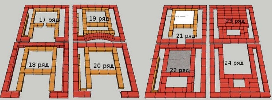 11 rang - habillage de la rangée précédente, alignement avec le cavalier installé, dont la hauteur est d'environ 14 cm Maçonnerie de la 5ème rangée de la chambre de combustion avec des briques en argile réfractaire avec formation d'une sortie pour les fumées. Habituellement, cette sortie est appelée «hailo», et sa particularité consiste en la charge thermique la plus forte.