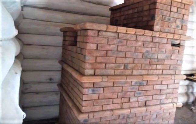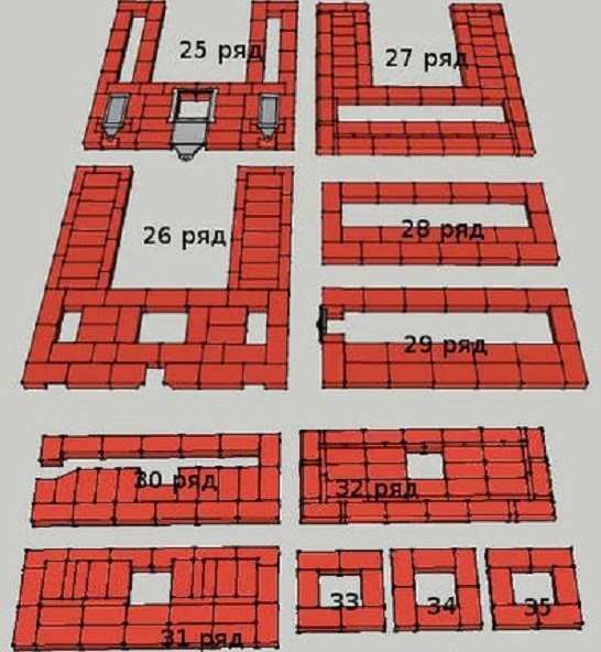 28 rang - Une autre "ceinture" de briques arrondies. Trois canaux de cheminée sont connectés dans une chambre.