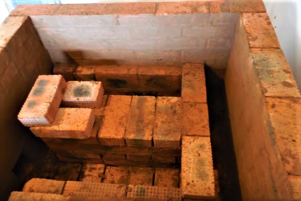 6 rangs - le chevauchement des extrémités des canaux inférieurs, le reste est une continuation de la rangée précédente.La deuxième rangée de briques en argile réfractaire doit être disposée, formant un entonnoir avec des biseaux - c'est ici, sur la grille, que les charbons tomberont pour brûler.