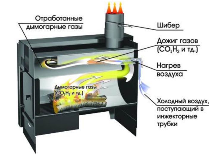 L'une des caractéristiques des appareils de chauffage est le post-brûleur secondaire, qui se caractérise par une combustion lente du combustible. Autrement dit, les bûches dans le four ne brûlent pas, mais brûlent. Cet effet est obtenu en ajustant la quantité d'air entrant dans la chambre à carburant.