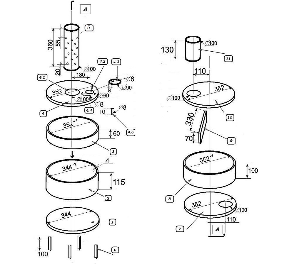 Maintenant, vous devez faire la postcombustion. Pour ce faire, coupez un autre morceau d'environ 110 mm de haut dans un tuyau large. Pour le fond, un cercle d'acier de 4 mm est fait, mais un métal de six millimètres est placé sur le dessus. Faites ensuite des trous pour fixer le tuyau perforé et pour la cheminée.