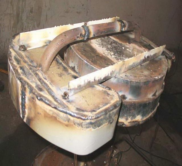 Vous aurez également besoin de pièces auxiliaires, telles qu'une buse de protection pour la cheminée, un dispositif pour faire le plein en toute sécurité, une ceinture de renfort, etc. L'huile usagée est versée dans la chambre inférieure et incendiée. Ici, il brûle partiellement à une température relativement basse.