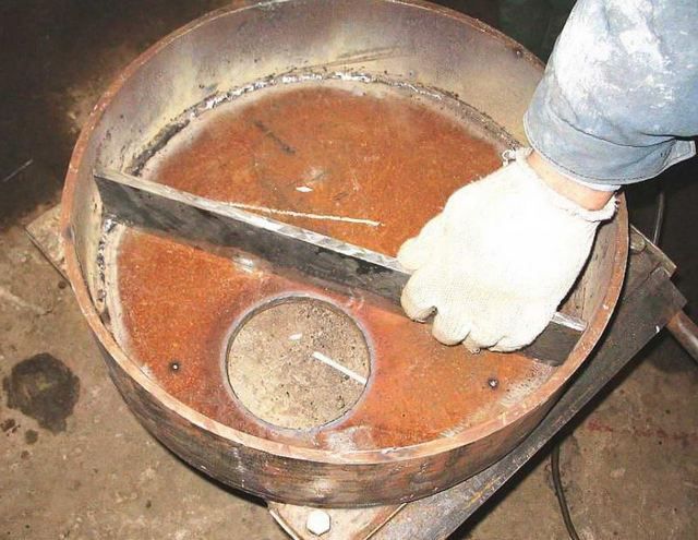 Ensuite, ils saisissent le tuyau pour fixer la bonne position. Après cela, une soudure peut être réalisée. Ensuite, de la même manière, un conduit de fumée est soudé au trou correspondant.