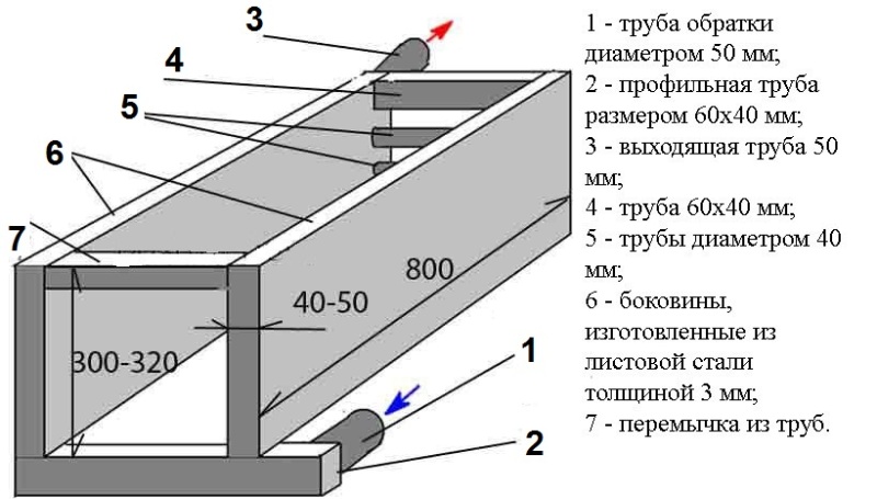 Un tuyau en acier inoxydable d'un diamètre de 80 à 120 mm posé autour de la maison est un registre de chauffage composé d'une alimentation du four et d'un retour vers celui-ci. Dans la pièce la plus éloignée du four, ces lignes sont reliées entre elles, et dans le reste des pièces elles sont posées sous forme de deux canalisations le long des murs extérieurs.