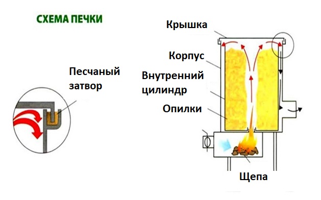 Un tuyau avec des trous installés dans le premier compartiment sert de post-brûleur secondaire - une décomposition par pyrolyse du carburant se produit à l'intérieur, qui s'évapore en raison du chauffage dans la première chambre.
