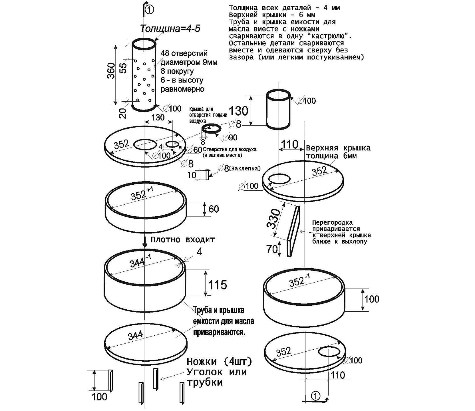 - Un fond et un couvercle avec des trous sont soudés à l'anneau avec une hauteur plus élevée: le premier avec un diamètre d'environ 100 mm sous le tuyau; le second est de petite taille pour l'admission d'air. Pour un souffleur, un obturateur est fabriqué à partir d'une tasse d'un diamètre légèrement plus grand.