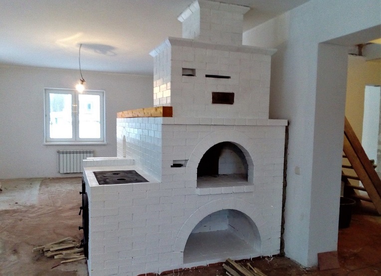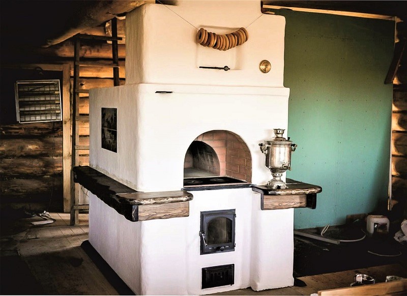 L'une des solutions les plus appréciées, combinant tous les avantages d'un vrai four russe: un grand creuset pour la cuisson du pain, une cuisinière pratique et un large banc de poêle, qui peut être utilisé comme lit d'appoint lors des froides nuits d'hiver.