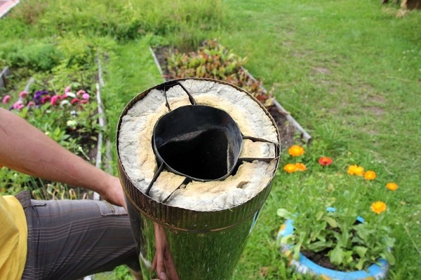 La laine de basalte peut résister à des températures allant jusqu'à 600 ° C, la céramique - jusqu'à 1000 ° C. Les deux matériaux ont de bonnes propriétés d'isolation thermique. Appliquer une couche d'isolant de 25 à 50 mm. Pour une cheminée qui est montée à l'extérieur, plus elle sera grande, mieux ce sera.