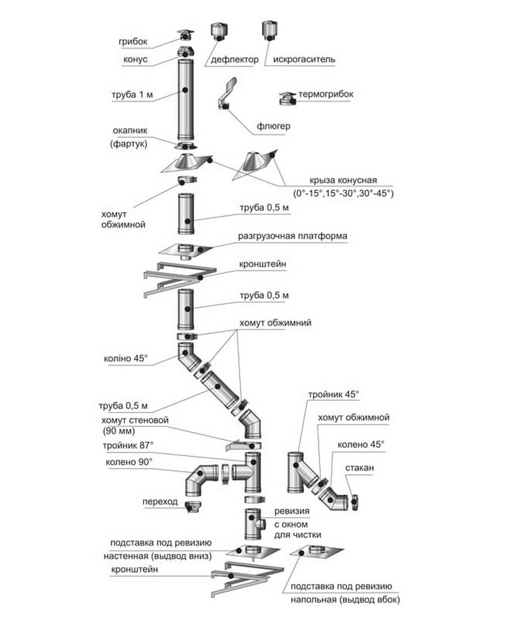 Pour ce travail, une connaissance de la conception de la cheminée et de son installation sera nécessaire - c'est ce matériau que nous avons examiné en détail dans notre article. Nous avons pris des photos et des schémas décrivant les principaux éléments du système de cheminée, donné des instructions étape par étape pour l'assemblage et l'installation.