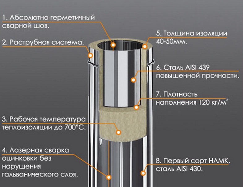 Un autre indicateur qui affecte le diamètre de la cheminée est l'épaisseur de la couche isolante. Elle peut être de 25 à 100 mm. Plus il est grand, mieux il montre ses propriétés, mais sa valeur augmente également. L'épaisseur du métal lui-même utilisé pour la production de tuyaux peut aller jusqu'à un millimètre.