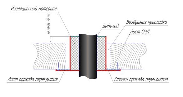 Pour passer à travers le plafond et, surtout, à travers des matériaux facilement inflammables, une unité de passage spéciale est également utilisée. Un espace d'air est laissé entre le contour extérieur et la surface intérieure de l'ensemble.