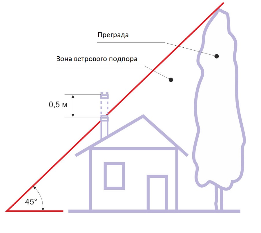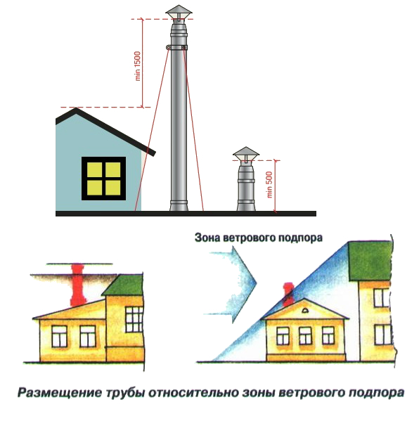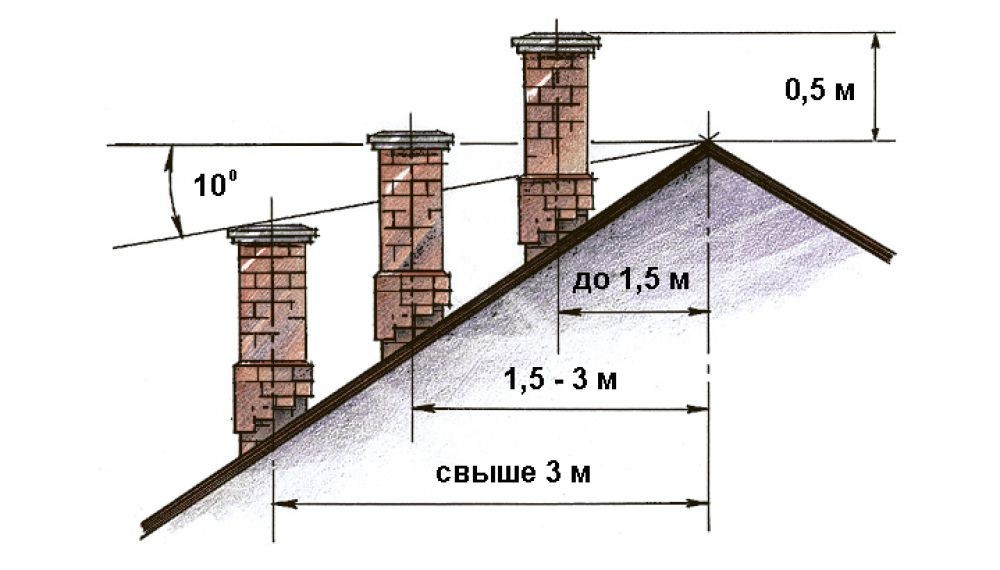 La hauteur du tuyau de cheminée dépend de la distance entre la base du tuyau et la crête, mais pas moins d'un demi-mètre au-dessus de la crête, 1,2 m au-dessus de la surface d'un toit plat ou 2 m avec un toit combiné. Si la pointe de la crête est à un mètre et demi à trois mètres de distance, elle doit être placée plus haut ou en face de la crête.