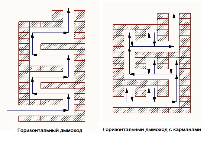 Système de canaux horizontaux Il est rarement utilisé. Il réchauffe le four uniformément, mais pour chaque niveau horizontal, vous devrez faire une porte propre. Une modification de cette cheminée peut être une option avec poches. Ces cavités retiendront la fumée pendant un certain temps et augmenteront l'efficacité du poêle.