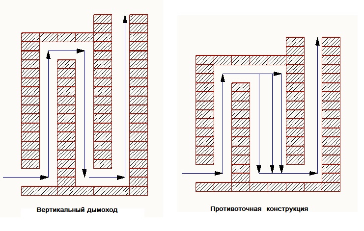 Dans le sens du mouvement des fumées, les poêles à circuits de fumée sont divisés en flux continu et contre-courant. Dans le deuxième mode de réalisation, la fumée, avant de pénétrer dans la cheminée, effectue plusieurs révolutions à l'intérieur de l'une des chambres à fumée. Il se déplace à ce moment dans deux directions différentes.