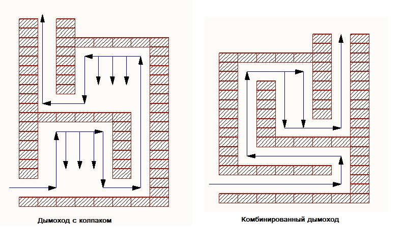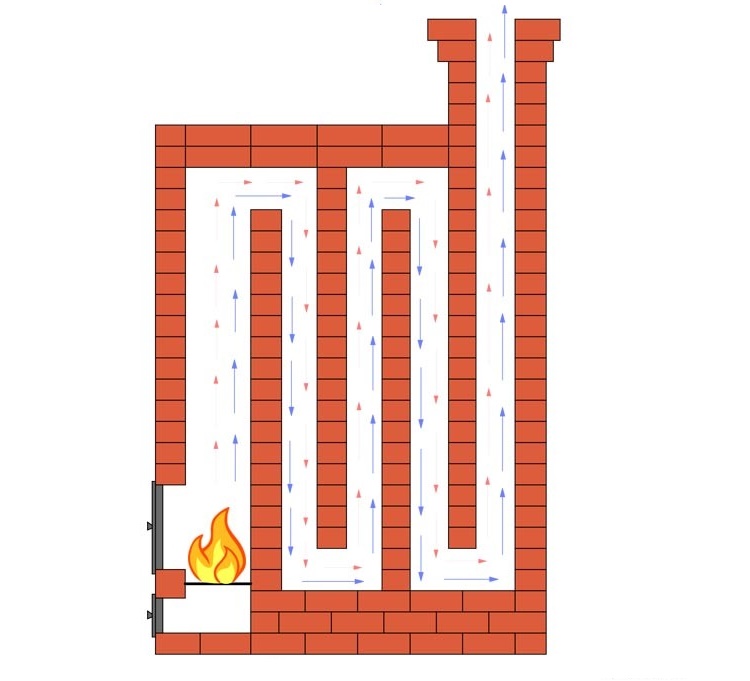 En bas, il y a une chambre de combustion, en haut, il y a un réseau ramifié d'échappement de fumée, comprenant plusieurs canaux verticaux reliés entre eux par des cavaliers horizontaux. En conséquence, le chemin le long duquel la fumée se déplace est allongé et la chaleur reste dans la maison.