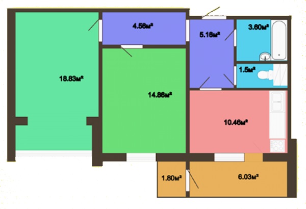Nous partirons des données suivantes. La superficie de la salle commune est de 18,83 m2, chambre - 14.86 m2, cuisine - 10,46 m2, balcon - 7,83 m2 (montant), couloir - 9,72 m2 (montant), salle de bain - 3,60 m2, toilettes - 1,5 m2. Portes d'entrée - 2,20 m2, vitrine de la salle commune - 8,1 m2, fenêtre de la chambre - 1,96 m2, fenêtre de la cuisine - 1,96 m2.