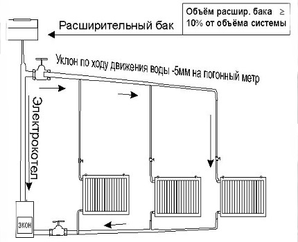 Les tuyaux horizontaux sont inclinés dans le circuit de chauffage, créant ainsi des conditions pour le mouvement du fluide de travail sous l'influence de la gravité.