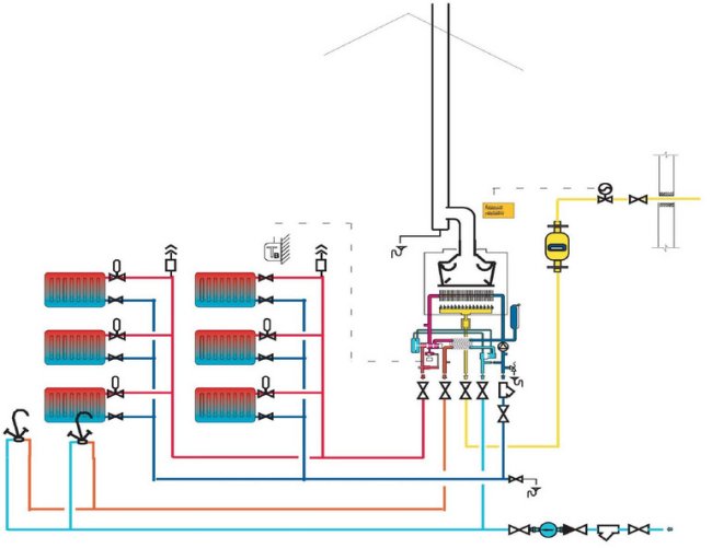 De tels schémas peuvent être utilisés lors de l'installation de chauffage dans des bâtiments de toute taille. Il suffit de choisir une pompe de circulation avec des indicateurs de puissance appropriés et de fournir de l'énergie.