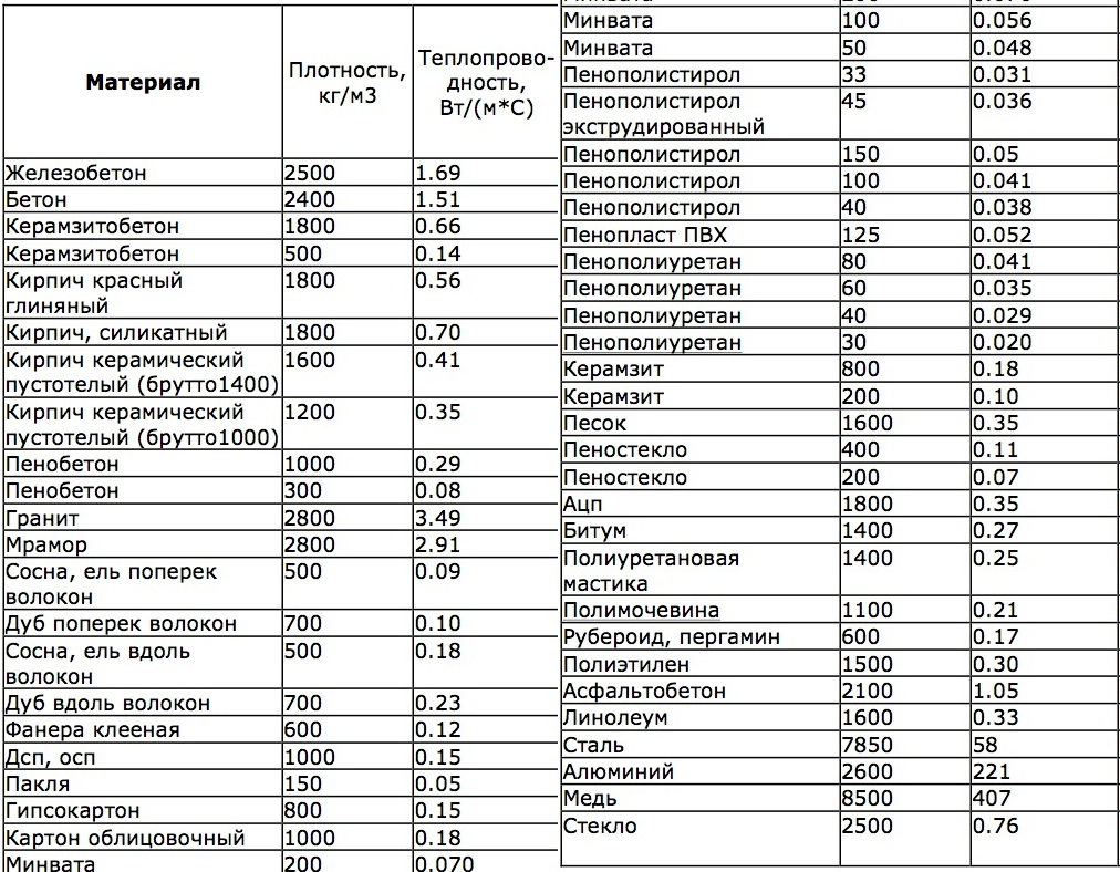 De plus, selon les ouvrages ou tableaux de référence donnés à la fin de ce chapitre, nous sélectionnons les valeurs nécessaires du coefficient de conductivité thermique pour chaque matériau. Nous vous recommandons de lire plus en détail avec coefficient de conductivité thermique et ses valeurs pour les matériaux de construction les plus populaires.