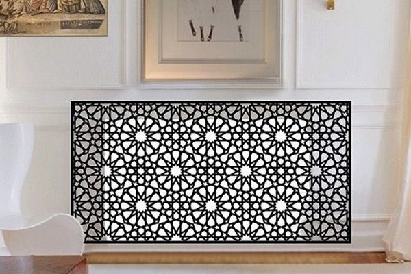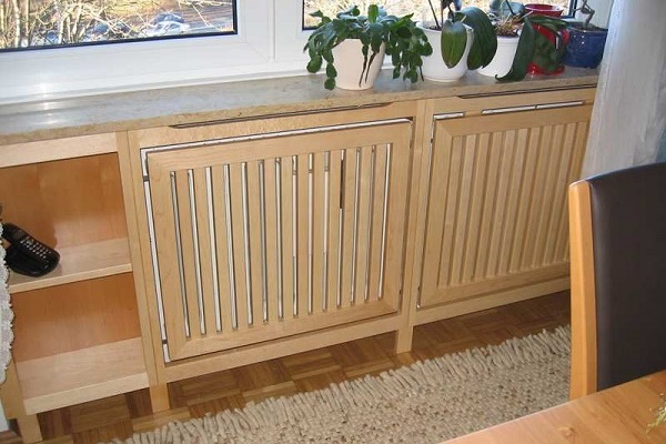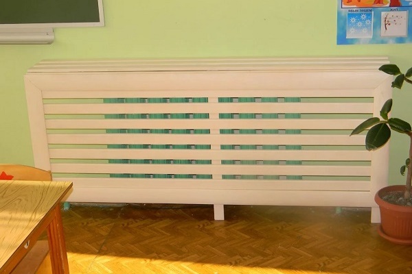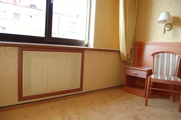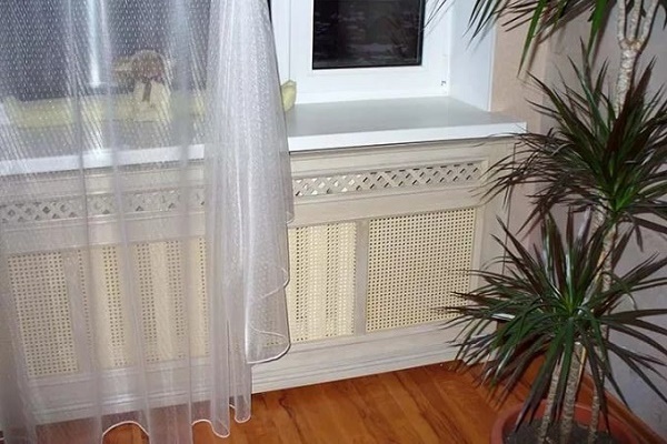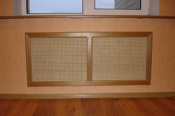 L'apparence de l'écran en bois ressemble à un treillis en osier et semble impressionnante et élégante. Une grille en bois est idéale pour masquer la batterie située sous la fenêtre. Une telle conception avec un nombre suffisant de trous n'empêche pas la pénétration de l'air chaud et assure une bonne convection.