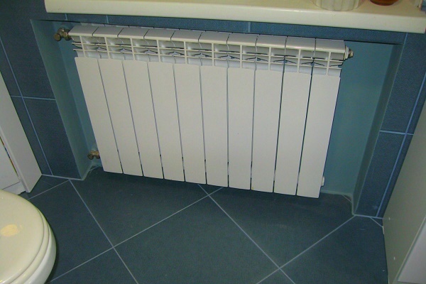 Quant à l'emplacement du radiateur au sol, vous pouvez vous limiter à installer un écran. Pour la fabrication de l'écran, le MDF et le plastique conviennent, il peut également s'agir de verre et de métal chromé - ces matériaux vont bien avec la propreté stérile et la brillance des carreaux de céramique.